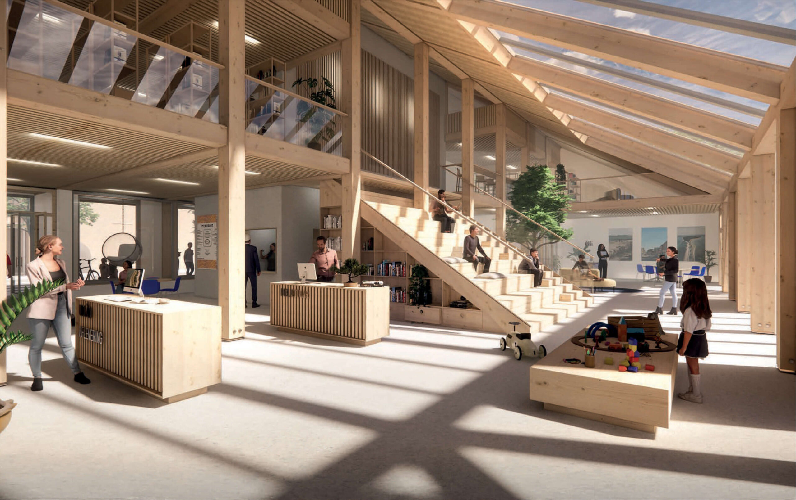 Byens Hus bliver et åbent, inviterende mødested med bibliotek, borgerservice, café, studiemiljøer og fleksible rammer til fællesskab og aktiviteter for alle.