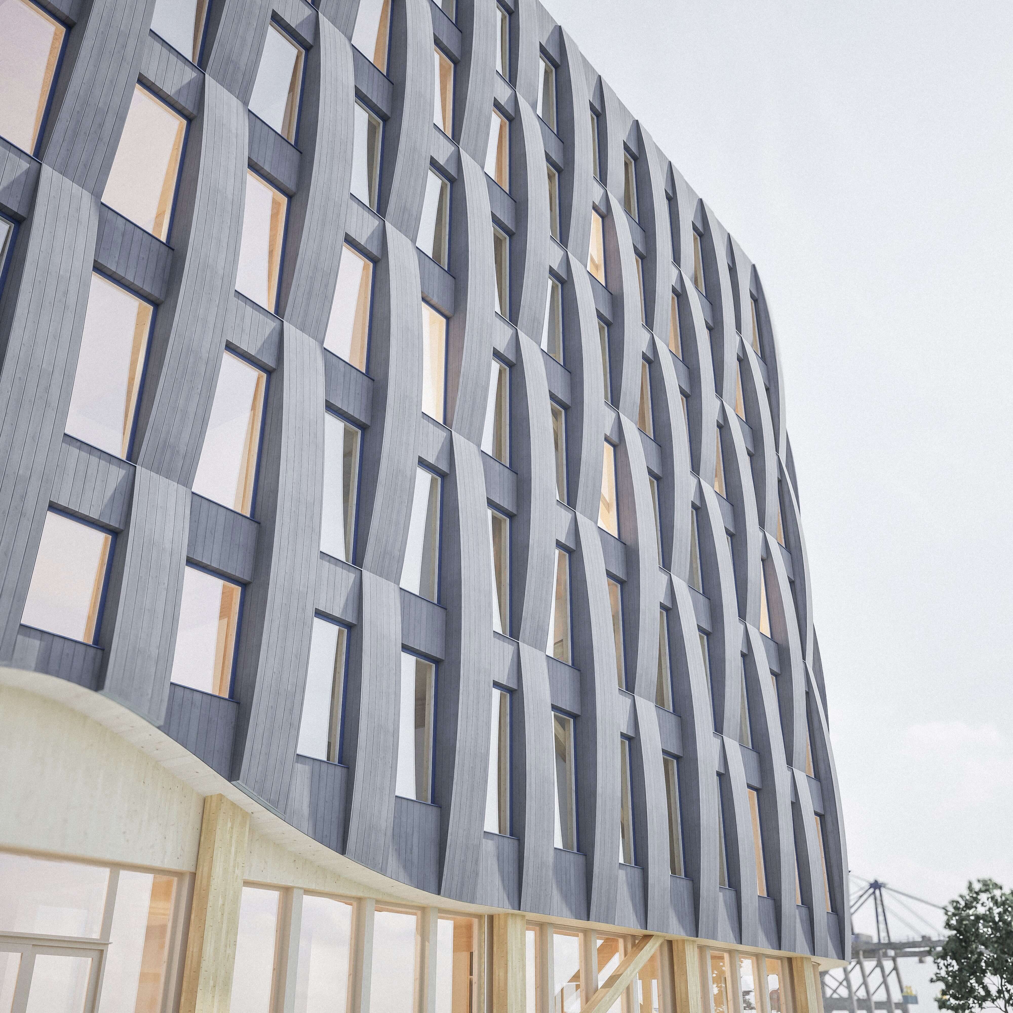 Bygningen opføres i limtræ og beklædes med kernetræ i fyr, hvilket ikke blot sikrer et varmt og naturligt udtryk, men også reducerer CO₂-aftrykket markant sammenlignet med traditionelle byggematerialer. På taget installeres solceller, som bidrager til bygningens energiklasse A.
